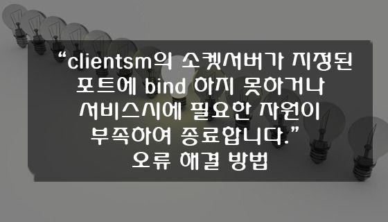 “clientsm의 소켓서버가 지정된 포트에 bind 하지 못하거나 서비스시에 필요한 자원이 부족하여 종료합니다.” 오류 해결 방법