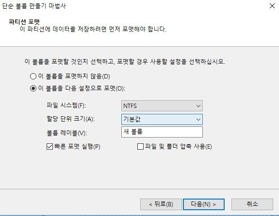 이제 드라이브를 포맷하는 과정입니다. 단순히 기존에 있던 것을 파일들을 지우는 의미만 있는 것이 아니라, 파일 시스템을 바꾸는 과정도 있습니다. NTFS와 exFAT 등이 있는데요. 자세한 것은 제 블로그에 찾아보시면 관련 내용이 있기도 하고, 검색해보시면 알 수 있습니다. 보통 1TB 이상의 대용량의 경우 NTFS로 하시면 됩니다. 아마도 이미 파일 시스템이 NTFS일 것입니다. 그럴 경우에는 이 볼륨을 포맷하지 않음을 선택하셔도 문제 없습니다.
