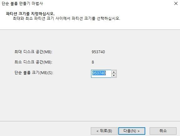 그러면 위와 같은 화면이 나타나는데요. 크기를 지정하여 실제로는 하나의 디스크지만 컴퓨터에서 가상으로 2개로 나눌 수도 있습니다. 하지만 저는 1TB이고 굳이 나눌 필요가 없어서 그냥 바로 진행하겠습니다. 2TB이거나 그 이상의 하드디스크인 경우 1TB씩 나누거나 하는 것이 가능하다는 이야기입니다.