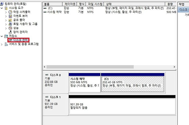 그리고 왼쪽 메뉴에서 디스크 관리를 누릅니다. 그러면 위와 같이 나타나는데요. 저는 250GB의 SSD와 1TB의 HDD가 장착되어 있습니다. 하지만 HDD의 경우 파티션 할당을 해주지 않았기 때문에 현재 사용할 수 있는 상태는 아닙니다.