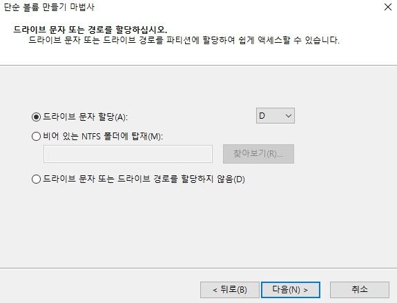 그 다음 과정은 드라이브 문자 할당 과정입니다. OS가 깔린 드라이브가 C드라이브인데요. 그 뒤부터 D, E 이렇게 순서대로 지정하시면 됩니다.