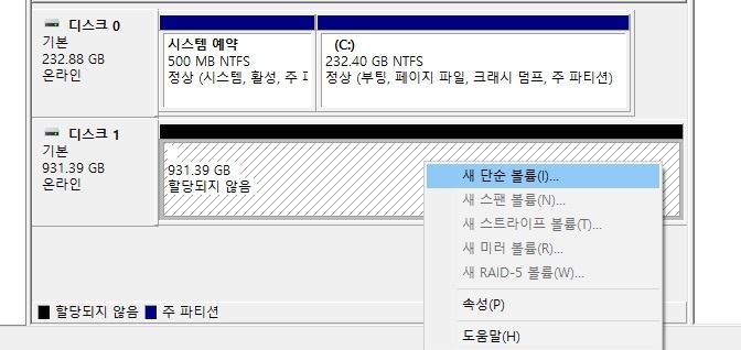 디스크 1, 즉, 할당되지 않은 디스크(빗금쳐져있는 부분)에 마우스 오른쪽 버튼을 클릭하고 새 단순 볼륨을 클릭 합니다.