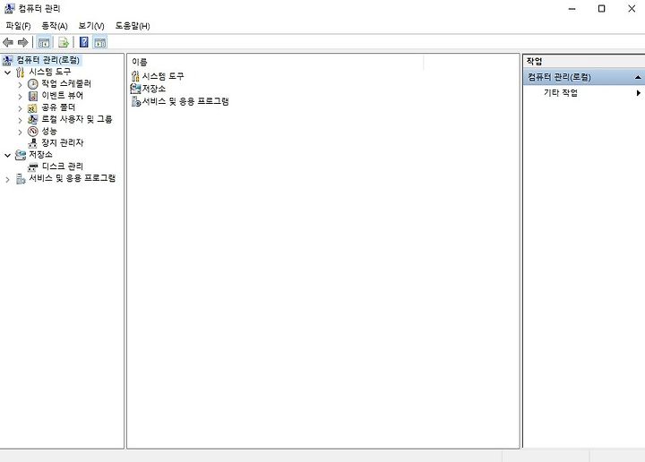 윈도우10의 경우 윈도우키+S를 누르면 검색창이 나타나는데요. 컴퓨터 관리라고 입력하여 위와 같이 컴퓨터 관리 화면을 띄웁니다.
