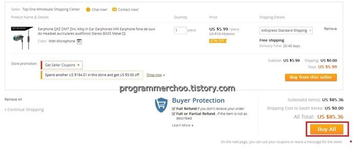 이것저것 구매하실 제품을 장바구니에 담고 장바구니로 가서 맨아래에 가격 확인하시고 Buy All 버튼을 클릭합니다.